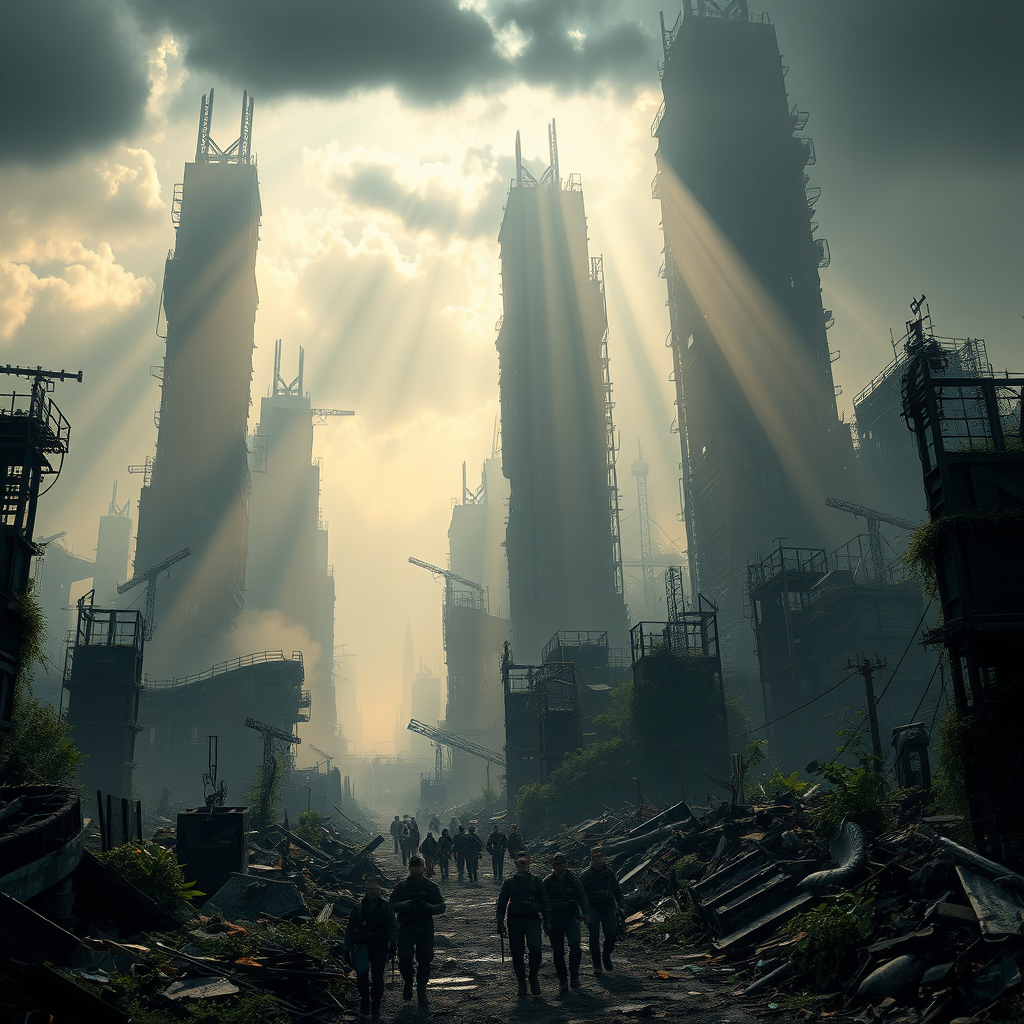 An awe-inspiring dystopian landscape with towering, dilapidated skyscrapers shrouded in mist, casting long shadows across a desolate cityscape. The scene features remnants of advanced technology intertwined with overgrown nature, creating an eerie yet captivating contrast. In the foreground, a small group of survivors clad in rugged attire navigates the cluttered streets, their faces determined and hopeful. A brooding sky looms overhead, pierced by beams of sunlight that illuminate pockets of the devastated terrain, adding a cinematic and epic feeling to the overwhelming stillness.
