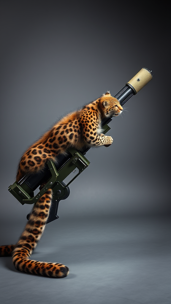An awe-inspiring image showcases an antitank rocket launcher artfully adorned in leopard fur, transforming a BGM 71 TOW missile launcher into a provocative art piece. The juxtaposition of the heavy weapon and the delicate animal skin invites thoughtful reflection. Set against a neutral grey backdrop in a professional photography studio, the scene is illuminated with softbox lighting, creating a bokeh effect. A 45-degree camera angle captures a close-up with a 35mm lens at ISO 100, low shutter speed, and aperture f4, resulting in a professional-grade product photograph of exceptional quality.