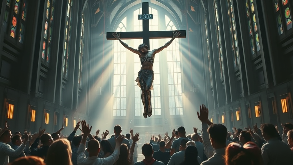 An awe-inspiring impressionist oil painting depicting a futuristic cyber Christ hanging from a techno cross. This Christ figure is adorned with intricate cybernetic implants, facing a congregation of believers who exult and worship him with raised hands. The scene is set inside a vast futuristic techno cathedral, conveying a mood that is both futuristic and ceremonial, with a grandiose, cyberpunk, sci-fi, neo-futuristic atmosphere. Dark ambiance fills the space, while light rays shine through towering stained glass windows, creating dramatic and cinematic lighting effects. The ultra-wide shot captures the depth of field, reflecting the impressionist style reminiscent of Claude Monet. This evocative image symbolizes technology as the new faith of humanity, portraying people praying at the altar of technology to a techno Christ in a traditional impressionist style.