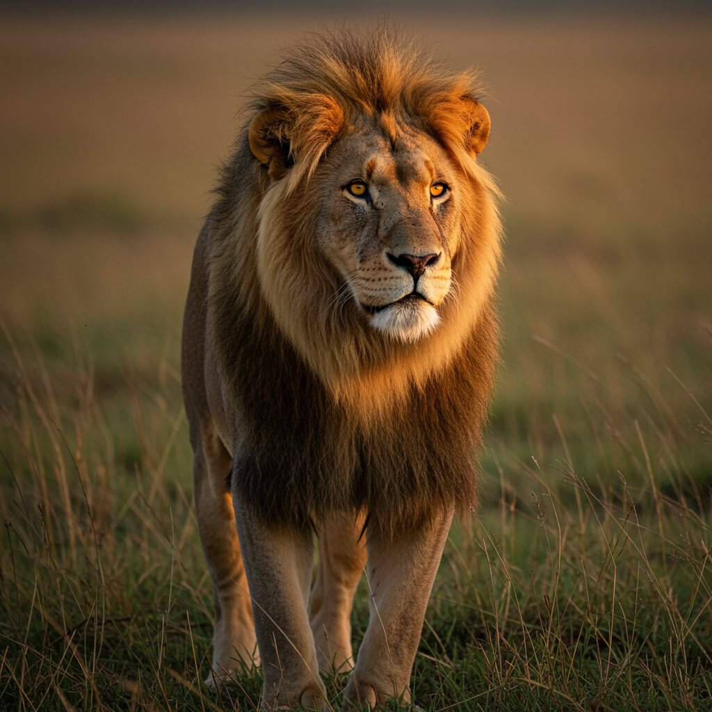 An awe-inspiring portrait of a male lion standing majestically in the luminous glow of the African savannah's golden hour. This formidable predator embodies grandeur and dominance, with striking yellow eyes that gaze intently into the horizon. His majestic mane encircles his face, the rich tawny shades capturing the light and creating a halo-like effect. The lion's powerful physique is coiled with vitality, and his lustrous coat shimmers in the warm embrace of the setting sun. Captured with a Canon EOS-1D X Mark II DSLR camera equipped with a 300mm f/2.8L IS II USM lens, the image boasts a resolution of 20.2 megapixels and an ISO sensitivity setting of 800, ensuring meticulous detail of the lion's imposing characteristics. The camera operated in aperture priority mode with an f/2.8 aperture, producing a soft-focus background with a striking bokeh effect. A shutter speed of 1/1000 sec was employed to encapsulate the lion's motions crisply. Utilizing a circular polarizing filter minimized glare and enriched the vivid hues of the sky and savannah. The lion's piercing gaze and the dramatic light create a potent sense of presence and intensity, making this image truly arresting. Meticulous processing in Adobe Lightroom and Photoshop involved delicate color grading and contrast enhancements to amplify the lion's innate splendor, achieving a hyper-realistic, super-resolution, UHD composition. The result is a timeless visual masterpiece that encapsulates the spirit of the African plains and its most imposing predator—hyper-realistic, Super-Resolution, UHD, DTM, HDR, 8K—an artwork with enduring allure.