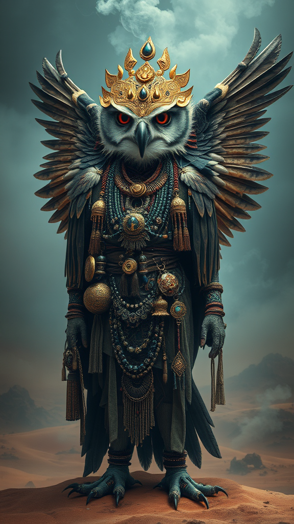 An awe-inspiring portrayal of an anthropomorphic eagle-owl shaman, exuding ancient wisdom and age-old mystique, adorned with extravagant trinkets and elaborate tribal decorations. The scene is magnificent and intricately detailed, embodying a hypermaximalist aesthetic with an air of luxury and opulence. The shaman stands in an atmospheric desert, shrouded in a veil of smoke that enhances the ominous and haunting ambiance. The composition resembles a cinematic matte painting, drawing inspiration from the artistic styles of Antonio J. Manzanedo, Vladimir Matyukhin, and Brian Froud. The setting conveys an otherworldly essence with a captivating blend of realism and fantasy.