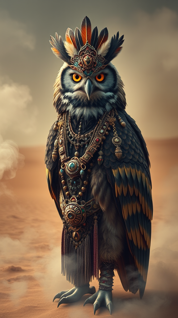 An awe-inspiring portrayal of an anthropomorphic eagle-owl shaman, exuding ancient wisdom and adorned with exquisite trinkets; every feather and talisman meticulously crafted in a tribal and mesmerizing style. This captivating figure embodies luxury and intricate beauty, commanding attention with its hypermaximalist details. The ambiance is ominously serene, surrounded by wisps of smoke in an evocative desert landscape. The scene is hauntingly atmospheric, reminiscent of a cinematic, matte painting, inspired by the works of CGSociety artists like Antonio J. Manzanedo, Vladimir Matyukhin, and Brian Froud, where mythical elegance and enigmatic allure converge seamlessly.