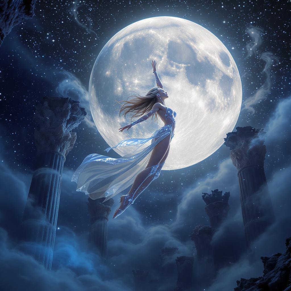 An awe-inspiring scene unfolds as a girl in a provocative outfit crafted from the finest crystalline threads gracefully ascends. Her diamond-like skin glitters with an extraordinary shimmer under the luminescent glow of a gigantic moon. She embodies divine beauty, soaring with superhuman grace above mystical, unearthly ruins that evoke the ritualistic ascent of a deity. The scene is hyper-detailed and hyper-realistic, blending into a stunning 4D dimension. A swirling ultramarine fog envelops the landscape, enhancing the dark aesthetic with an ethereal touch. Caught in a scandalous action pose, her full body is captured in an alluring position, exuding the essence of Dark Fantasy. Inspired by the style of Antonio J. Manzanedo, the environment is powered by the unreal engine, enriched with the cosmic vibe of a galaxy, bringing forth a surreal 3D octane ranger experience.
