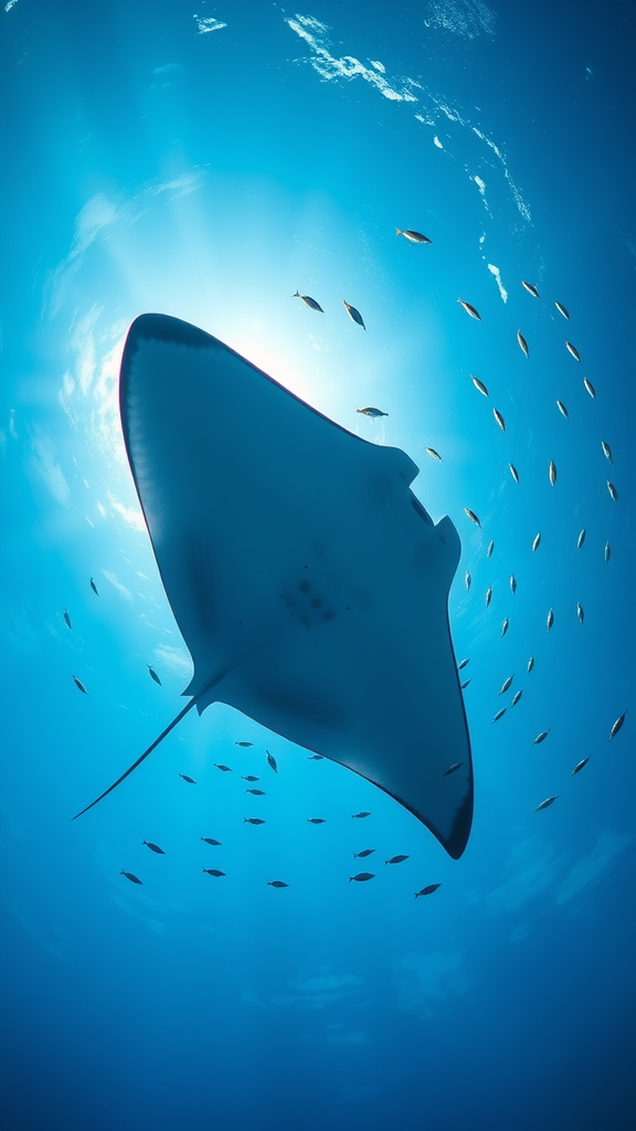 An awe-inspiring underwater photograph showcases the fluid motion of a distinguished manta ray as it effortlessly glides through the pristine azure waters of the ocean. Encircled by a school of colorful fish drifting in its slipstream, the scene creates a mesmerizing contrast between the gentle leviathan and its petite escorts. Shot from beneath, the manta ray is silhouetted against the radiant sunlight filtering through the ocean's surface, creating a breathtaking play of light and shadow. The expert use of illumination highlights the intricate patterns and textures along the manta ray's wings, as well as the iridescent scales of the small fish. Captured with a high-end underwater camera, the image beautifully conveys the ocean's enchanting allure and mysteries, encapsulating a moment of submerged wonder rarely witnessed, in hyper-detailed Super-Resolution, UHD, DTM, HDR, 8K resolution with a 4:3 aspect ratio and quality level 2.