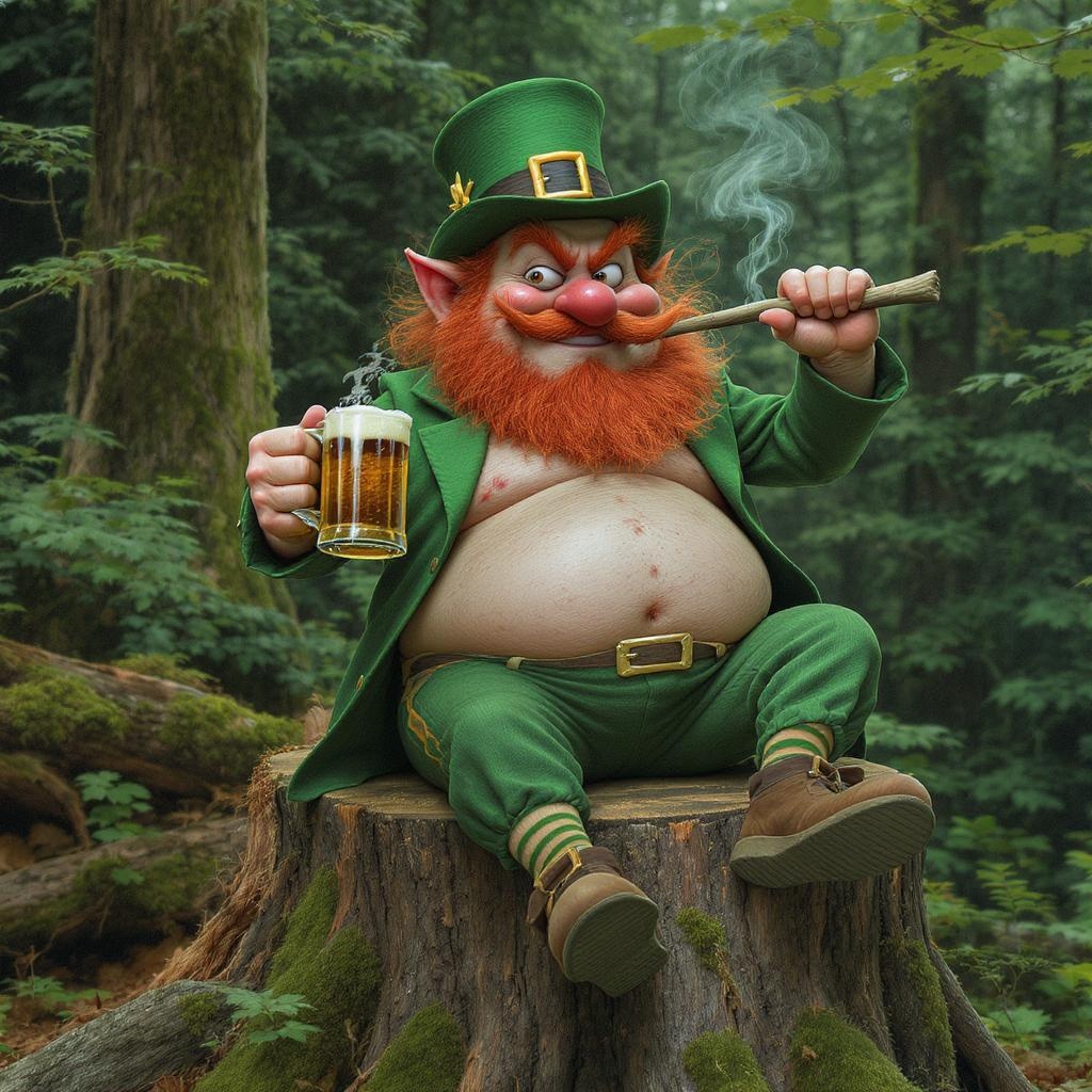 An eccentric leprechaun, with a tangled red beard and a mischievous glint in his eye, clutches a frothy mug of beer in one hand as he playfully taps himself with a stick in the other. Seated atop a moss-covered stump in a lush, verdant forest, this whimsical character is captured in a scene reminiscent of Herluf Bidstrup's storytelling flair, yet with a modern twist. The atmosphere feels straight out of a mid-2000s snapshot, grainy and imbued with a sense of nostalgia. The setting is alive with vibrant colors and intricate details that create a hyperrealistic portrayal. The leprechaun’s expression is cheeky and animated, his features exquisitely rendered with meticulous detail, bringing the fantastical to life in a way that might be trending on ArtStation today.