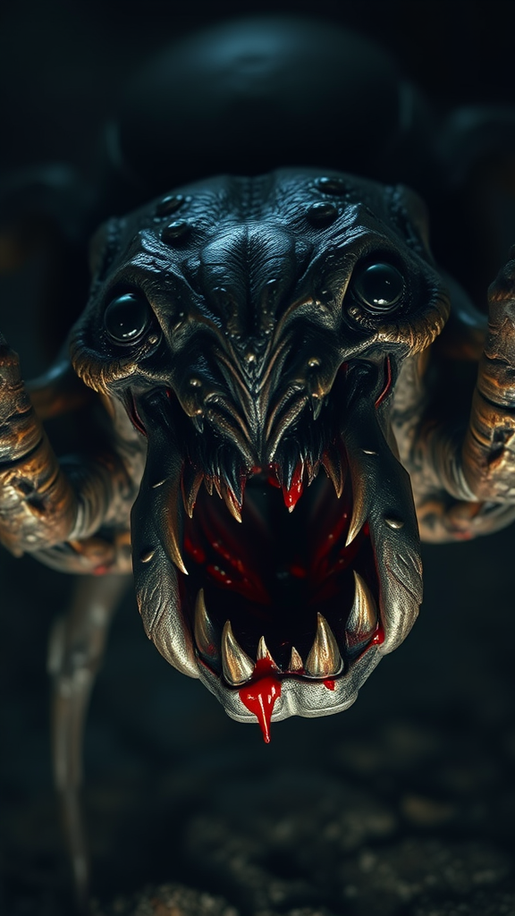An eerie and highly detailed depiction of an ancient spider, its skin intricately textured and illuminated by a haunting natural light. The setting is steeped in horror, with its mouth agape to reveal large, jagged teeth glistening with fresh blood. Black, lifeless eyes peer unflinchingly, framed by a visage marked with scars. In the shadows of a darkened backdrop, its massive fangs loom menacingly, embodying a nightmarish presence that chills to the bone.