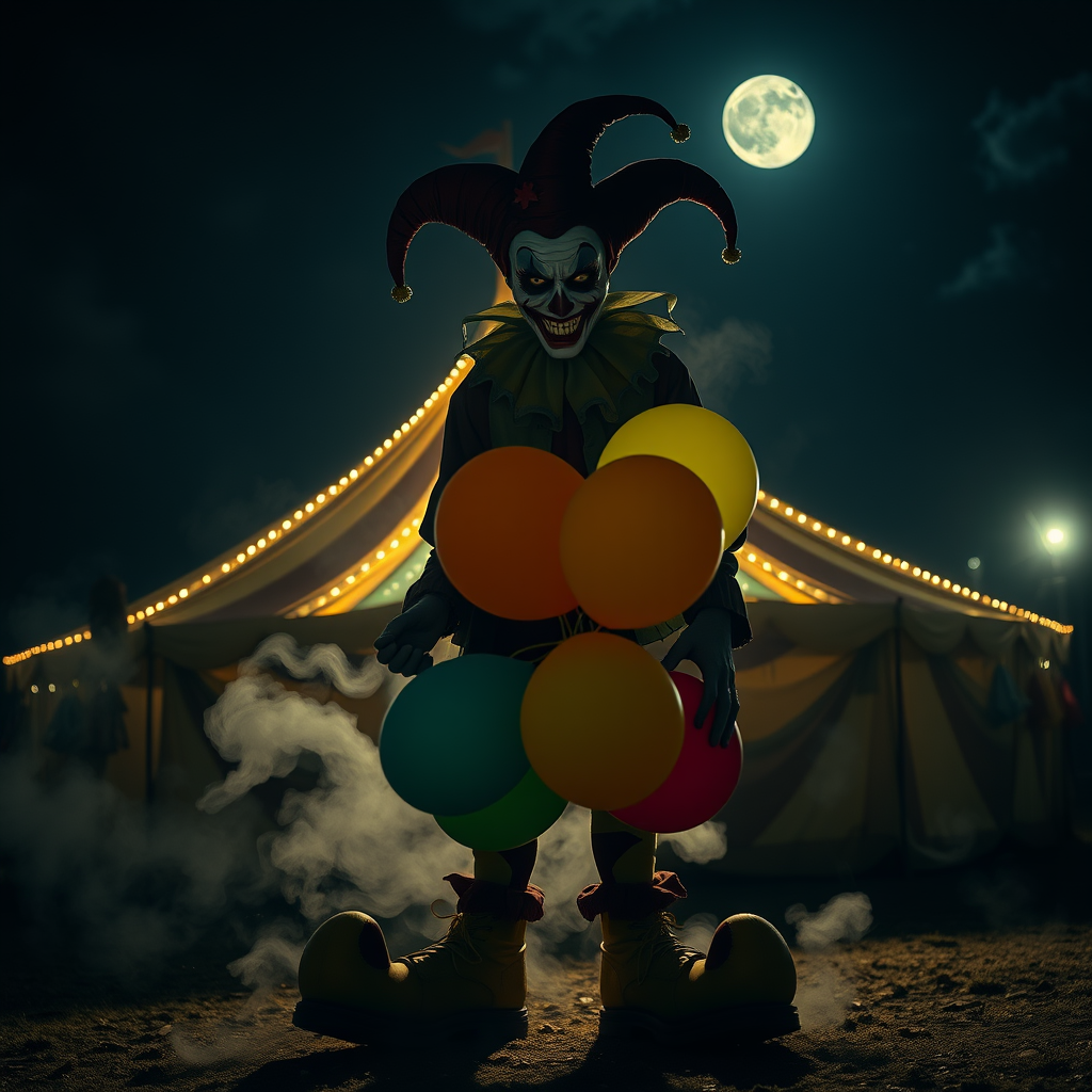 An eerie jester stands ominously before the illuminated circus tent under the moonlit night sky, his sinister grin highlighted by the dynamic backlighting that casts long shadows across his garishly painted face. The professional photograph captures the unsettling realism of his appearance, enhanced by the cinematic angle that adds depth to the scene. Mist swirls around his oversized shoes as he clutches brightly colored balloons, their vibrant hues contrasting with the dark, foreboding atmosphere.