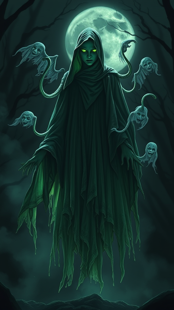 An eerie scene unfolds with a spectral sorceress standing tall, her figure shrouded in a flowing, tattered robe that whispers of forgotten eras. Her eyes radiate an unsettling, luminescent green, casting an otherworldly glow around her. Ethereal apparitions coil and circle around her form, their translucent visages wailing silently in the shadow-draped air. Atmospheric, cinematic lighting highlights her presence amidst the gloom, enhancing the chilling aura that envelopes her. The mood is steeped in horror, with eerie tendrils of fog threading through the moonlit scene, crafting an ominous, otherworldly atmosphere where ancient spirits and dark sorcery dwell.