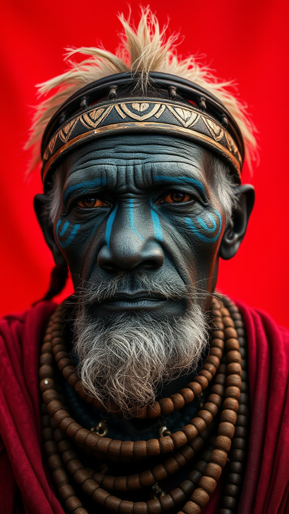 An elderly African warrior chief with fierce tribal panther makeup, where deep blue patterns are strikingly contrasted against a rich red background. His wise, serious eyes gaze into the distance, capturing a lifetime of battles and leadership. The portrait is hyper-realistic, accentuated by cinematic lighting that highlights the intricate details of his weathered face and the ceremonial attire he wears. His posture exudes strength and dignity, embodying the spirit of a true tribal leader.