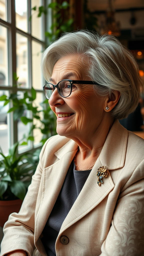 An elderly French woman with deep wrinkles and a warm smile, wearing delicate eyeglasses, sits in a quaint cafe adorned with lush greenery in the background. She gazes thoughtfully out the window, wearing a pastel linen blazer with an intricate floral pattern. The soft afternoon light filters through the windows, highlighting her gentle features. Captured in a relaxed side-angle view, the scene exudes a nostalgic charm, reminiscent of a photograph taken on Agfa Vista 200 film, with the warm ambiance reflecting a serene 4k visual quality. Her elegant persona is subtly complemented by a vintage brooch on her blazer.