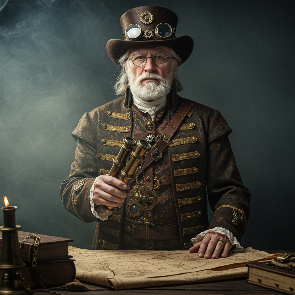 An elderly gentleman clad in intricate steampunk attire, adorned with gears and brass elements, stands amidst a smoky, atompunk-inspired backdrop. Intense lighting casts dramatic shadows on his weathered face, reminiscent of Aaron Jasinski's style, highlighting his keen eyes and determined expression. He holds a baroque maritime spyglass, accentuating his lifelong connection to the sea. The scene evokes a sense of adventure and mystery, reminiscent of a Dungeons & Dragons saga, where ancient maps and nautical charts are spread across a wooden table under the warm glow of flickering lanterns.