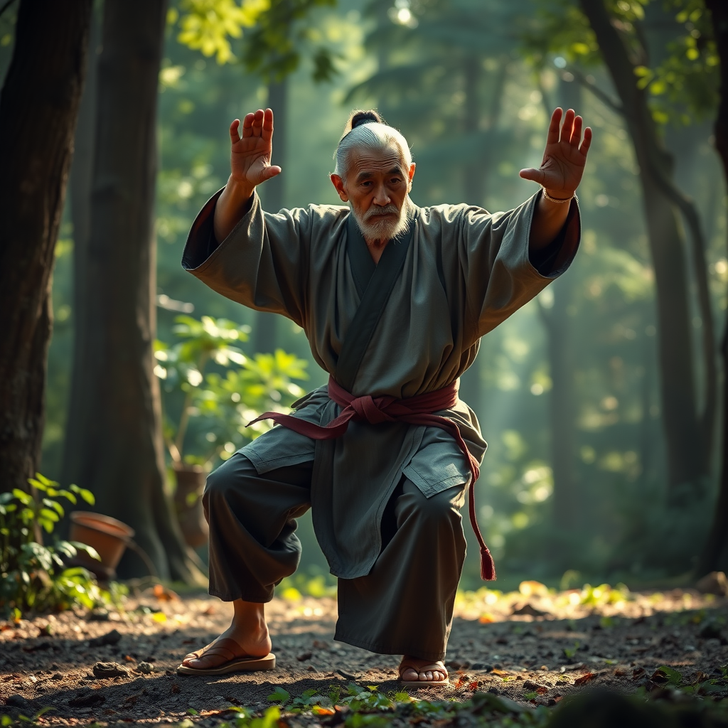An elderly Japanese man gracefully practicing martial arts amidst a serene and picturesque forest scene, captured with intricate detail and adhering to the rule of thirds and the golden ratio. The setting evokes a cinematic feel, reminiscent of a concept character art masterpiece. The style combines the classical oil painting techniques of Da Vinci with the vivid imagination of Greg Rutowski, enhanced by dramatic lighting that highlights the subject's focused expression and fluid movements. The atmosphere is enriched by soft, dappled sunlight filtering through the trees, casting gentle shadows on the lush greenery, creating an aura of timeless elegance and tranquility.