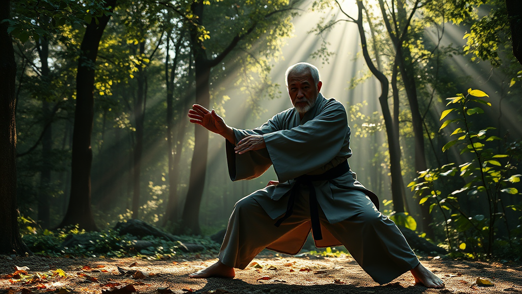 An elderly Japanese man, his face weathered with the wisdom of years, gracefully practices martial arts amidst a serene and lush forest setting. Sunlight filters through the canopy, casting dramatic patterns on the ground, highlighting the intricate details of his traditional attire. The scene is composed with a nod to the rule of thirds and the golden ratio, creating a harmonious balance that draws the viewer's eye. The atmosphere evokes a sense of timeless elegance, as if captured in a classical oil painting by the likes of Da Vinci, yet with the vivid flair characteristic of Greg Rutowski. The forest exudes an ethereal beauty, with every leaf and shadow rendered meticulously, enhancing the cinematic quality of the scene. Despite subtle artistic liberties, the core essence of dedication and serenity is captured in a masterpiece combining classical inspiration with contemporary sensibilities.
