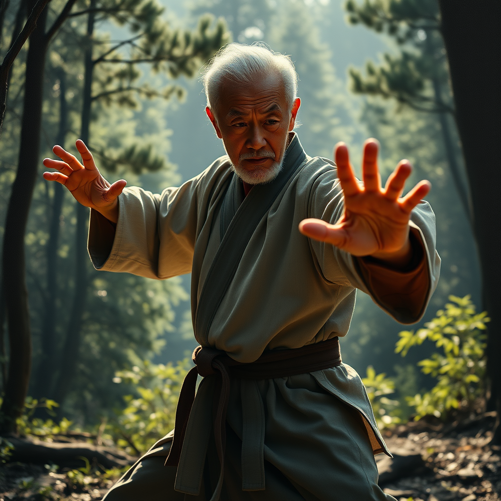 An elderly Japanese man, with an air of wisdom and vitality, practices martial arts amidst a serene and lush forest setting. The scene is intricately detailed, capturing the grace and precision of his movements. The composition follows the rule of thirds and the golden ratio, creating a harmonious balance. The lighting is dramatic, casting intriguing shadows and highlights across the landscape, reminiscent of a classical oil painting by master artists like Da Vinci and Greg Rutowski. The atmosphere is cinematic, with a timeless quality that speaks to the grandeur of a masterpiece. Despite the natural elegance, there is a subtle, abstract touch that distorts the hands in an unconventional manner, adding an element of intrigue to this otherwise classical portrayal. The canvas evokes the feel of a work by a lesser-known, avant-garde artist, challenging the boundaries of traditional art.