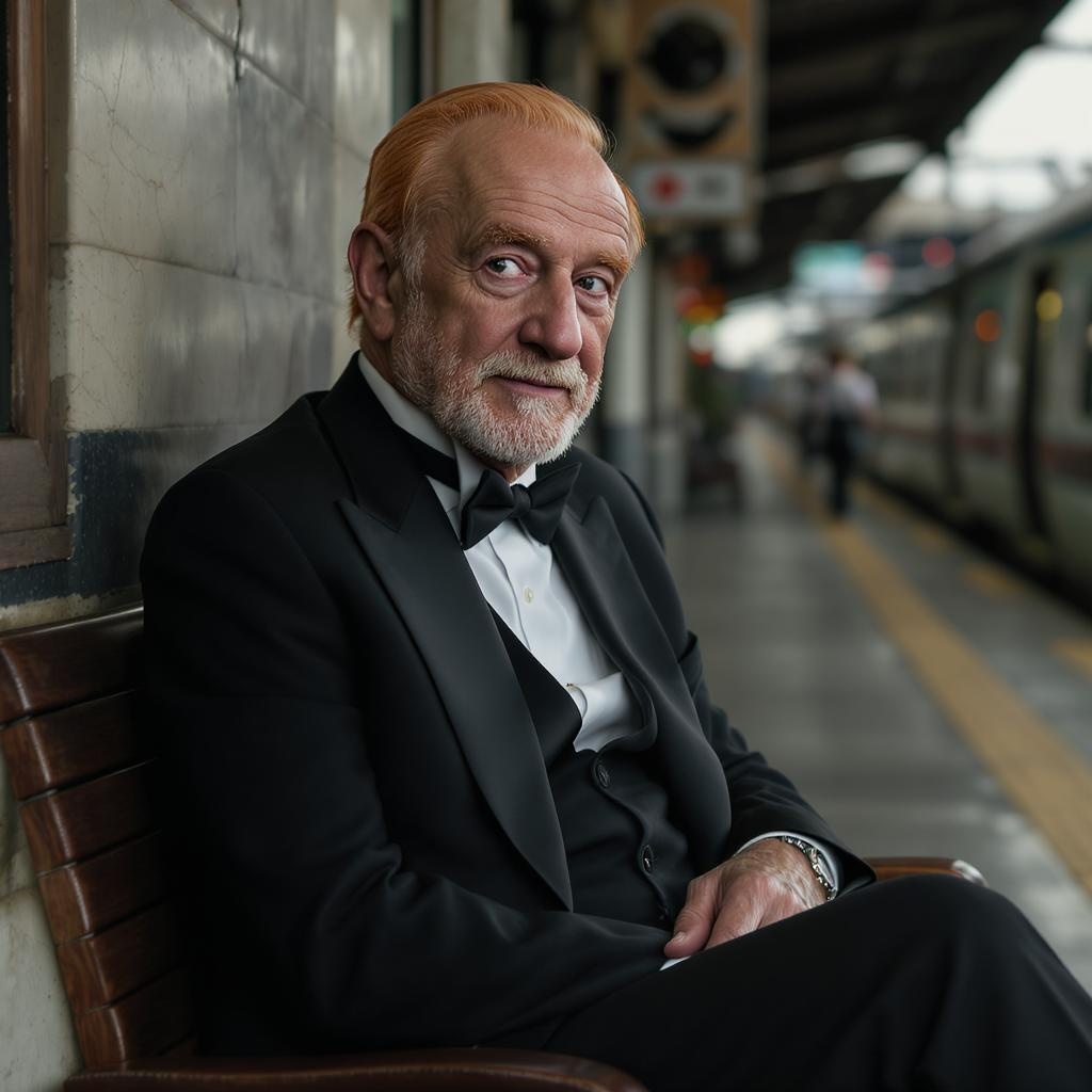 An elderly man is seated at a train station, donned in a crisp black tuxedo and matching trousers. His mature face, with unique features—short stubble, strong and manly, yet beautifully crafted with smooth lines—has an expressive look in his warm brown eyes, fiery red hair subtly framing his visage. The refined details of his thin lips and smooth nose are illuminated by soft natural light, bringing out a photorealistic touch. Captured with an 85 mm lens, the portrait presents an intimate composition with dramatic lighting, emphasizing the muted tones of his attire and surroundings. The piece, reminiscent of magic photography, displays excessive detail and a professional finish, enhanced by the bokeh effect and precise color correction akin to cinestill 800T film. The overall atmosphere maintains a realistic and polished aesthetic, avoiding distortions or unnatural elements, while preserving mystery and depth in its presentation.