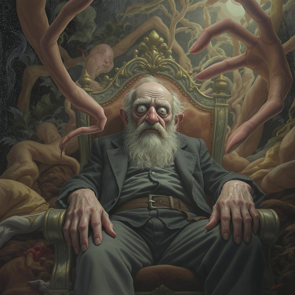 An elderly man seated in an ornate chair, surrounded by a labyrinth of intricate details, with a fantastical and cinematic ambiance. The scene is painted with a close-up perspective, showcasing detailed artistry and a cartoon-like, fantastical setting. The colors are muted with a subtle vignette effect. In the background, bizarre elements come into play: distorted anatomy and mutated features, such as extra and floating limbs, add a surreal twist. The old man's face appears disfigured and misshapen, with blurred and malformed features, enhancing the otherworldly atmosphere. His hands are depicted with unusual distortion, some appearing as absent or oddly placed, contributing to the eerie environment. Subtle hints of a dreamy, distorted world are present, enhancing the fantasy aspect and balancing the grotesque, imaginative vision with the serene, yet unsettling setting.