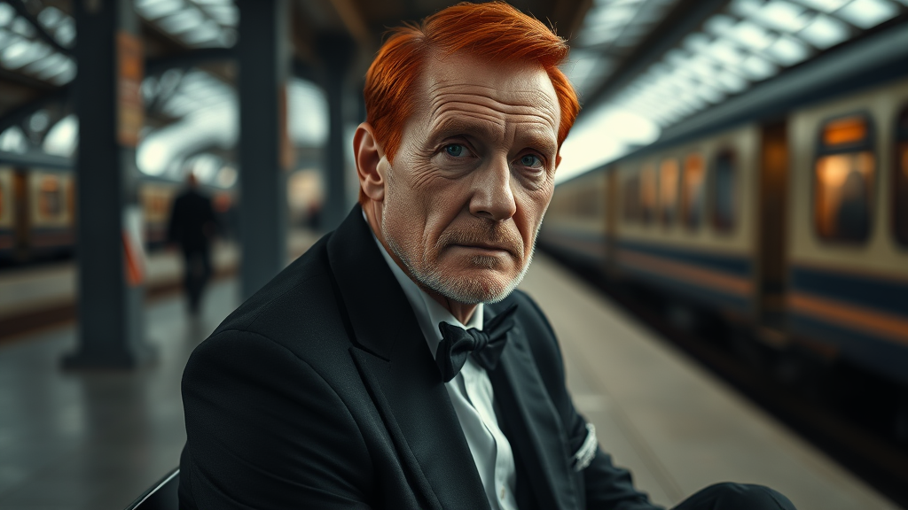 An elderly man sits at a train station, elegantly dressed in a black tuxedo and business trousers. He has short stubble and a distinctly masculine yet beautifully composed face. His brown eyes are striking beneath his red hair, which is cut short. His features, including a smooth nose and thin lips, are captured in muted tones, lending a timeless quality to the scene. Photographed with a professional touch, the scene is rendered in 8k resolution, utilizing soft natural lighting that enhances the intimate portrait. The 85 mm lens captures the magical photography and dramatic lighting, emphasizing photorealism with excessive detail. The intimate portrait composition is enriched by a bokeh effect, with careful color correction to achieve a Cinestill 800T look. The atmosphere maintains a mysterious and mystical feel, focusing on the man's poised presence and quiet dignity.