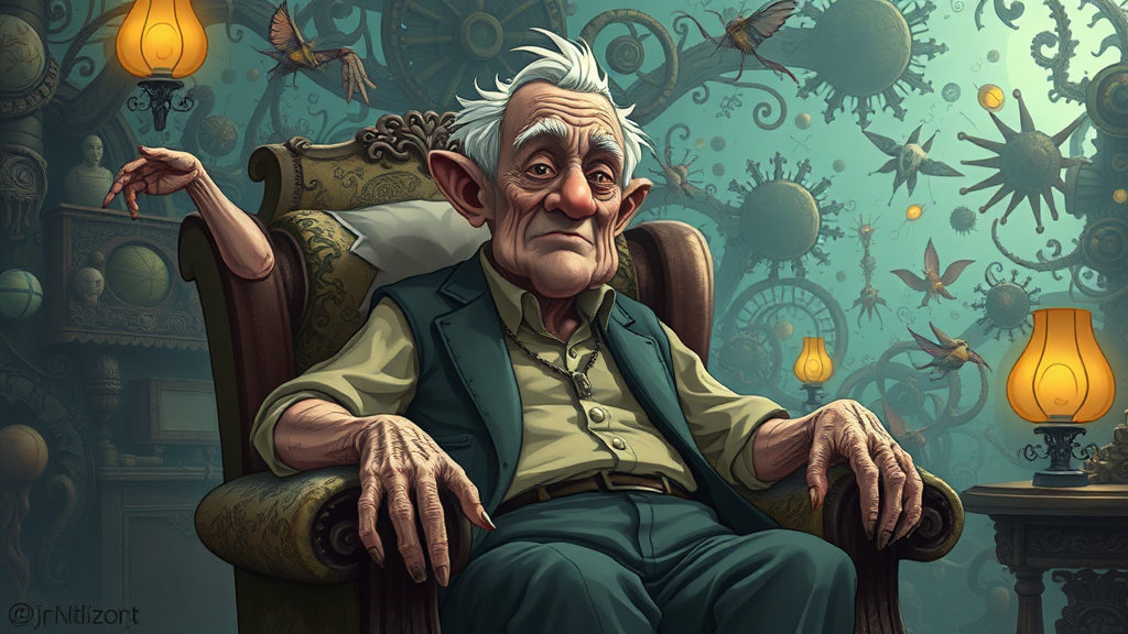 An elderly man sits comfortably in a chair, surrounded by a mesmerizing array of complex and intricate elements. The background is filled with fantastical details, creating an artistic and immersive scene. The composition is reminiscent of a cinematic shot, capturing the essence of fantasy with a low saturation palette and a subtle vignette effect. The character is depicted in a cartoon-like style, with elements of deformity and mutation giving it a unique and unconventional appearance. Limbs appear disfigured, with some floating or disconnected, and the hands are oddly malformed, lending an air of surrealism to the scene. The overall portrayal includes features that are intentionally bizarre and distorted, presenting an image that is both fascinating and unsettling, without any signs of watermark or oversaturation.