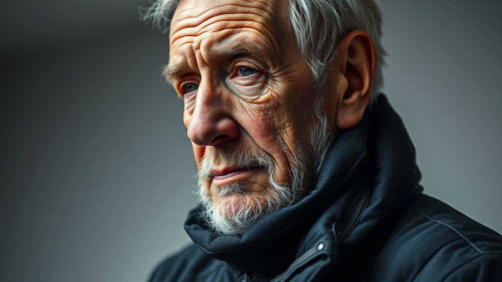 An elderly man wearing techwear in an ultra-realistic style, with highly detailed stitching and fabric textures. The scene is illuminated by studio lighting that casts soft, flattering shadows, highlighting the intricate layers of his attire. His expression is serene and contemplative, capturing the wisdom of his years. The overall composition is meticulously crafted to avoid any imperfections, ensuring a flawless representation while maintaining the core concept of advanced age meeting cutting-edge fashion.