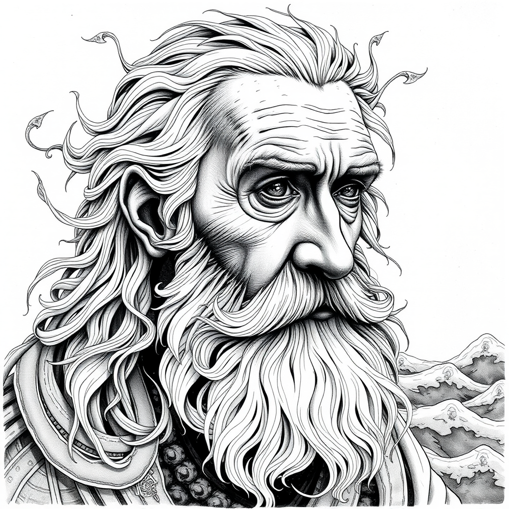 An elderly man with a flowing beard, his head and shoulders depicted in nautical surrealism, intricate compositions merging ink and wash techniques, with a psychedelic dreamscape atmosphere. Celtic art influences woven into the design, predominantly in shades of white and gray. Hints of cubist street art elements add depth and abstraction, creating a harmonious blend of tradition and modernity, capturing the essence of the sea and the mysteries it holds, the man's gaze enigmatic and wise, inviting and ethereal.