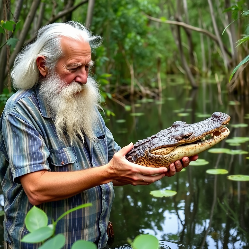 An elderly man with a flowing white beard gently strokes his loyal alligator amidst the lush greenery and serene waters of the southern swamp.