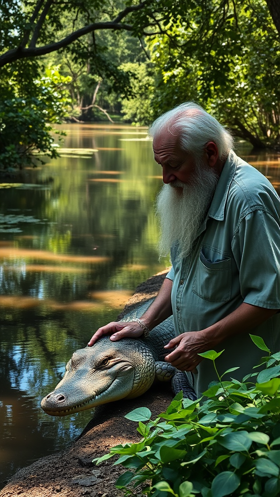 An elderly man with a long, wispy white beard gently strokes his pet alligator beside a meandering swamp, the dense foliage casting dappled shadows on the water's surface.