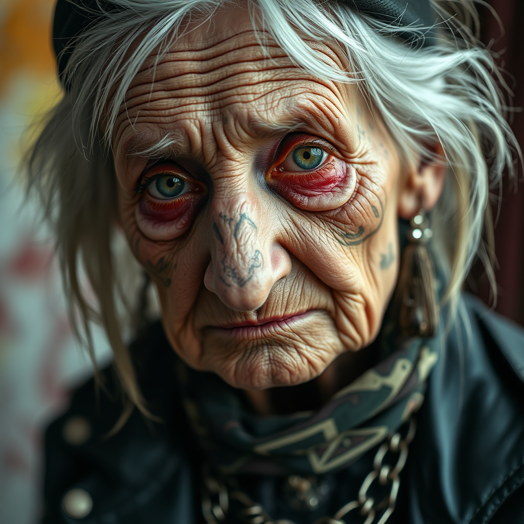 An elderly woman dressed in punk attire, her face a closeup showcasing a tapestry of wrinkles and intricate tattoos. The photography captures the essence of her detailed skin, presenting a photo-realistic, 8k quality image. The scene is set in high detail RAW color art with diffused soft lighting and a shallow depth of field. The focus remains sharp, embracing hyperrealism and cinematic lighting. The image avoids the pitfalls of low quality elements like errors, artifacts, or poor anatomy, presenting a captivating, unhindered view of this expressive subject in her full-length glory.