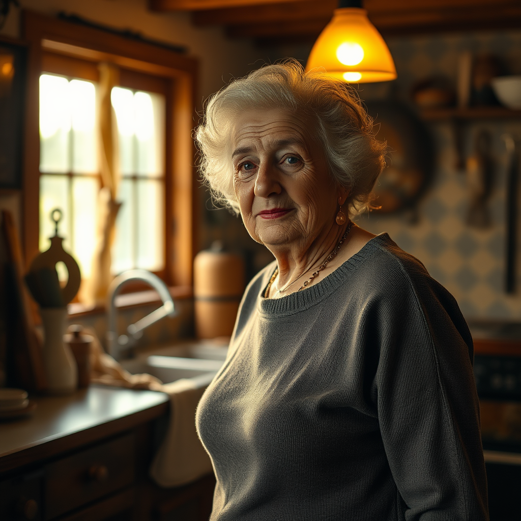 An elderly woman stands gracefully in the gentle glow emanating from a rustic kitchen, her features softly illuminated by the warm, nostalgic light, as she moves with a timeless elegance amidst the vintage surroundings.