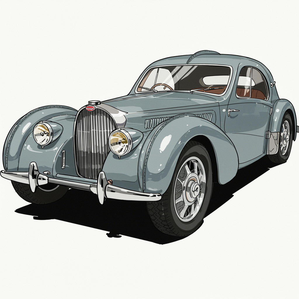 An elegant 1938 Bugatti Type 57SC Atlantic, illustrated in a detailed clipart style, highlighting its graceful curves, aerodynamic teardrop fenders, and exquisite design elements, set against a pristine white background. Modify the classic design with subtle enhancements like modern alloy wheels and a slightly elongated front hood, while retaining the iconic essence of luxury and timeless craftsmanship.