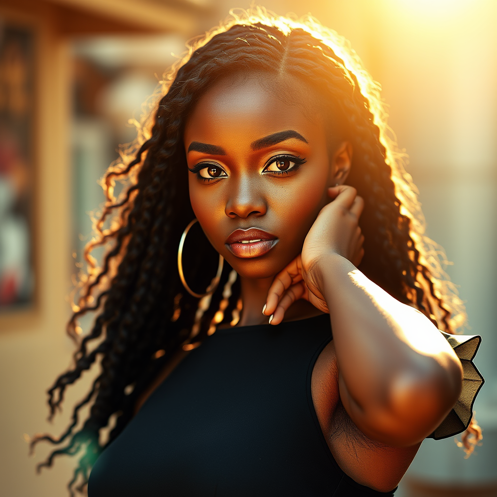 An elegant African woman in her 30s, wearing a stylish short dress, striking a confident pose. Rendered in a vivid manga style, capturing ultra-detailed, HD, 8K quality with exceptional highlights and perfect lighting. Her complexion features small freckles and evokes a touch of nostalgia. The scene resembles professional high-detail photography highlighting her textured skin, intricate skin details, and visible pores. The image is photorealistic with sharp focus, utilizing a Nikon D7500 with a 24mm lens at f/1.4, ISO 100, and a 1/1600s shutter speed. Presented in extraordinary UHD 64k quality, RAW, and unedited to maintain a dramatic depth of field and enchanting bokeh effects.