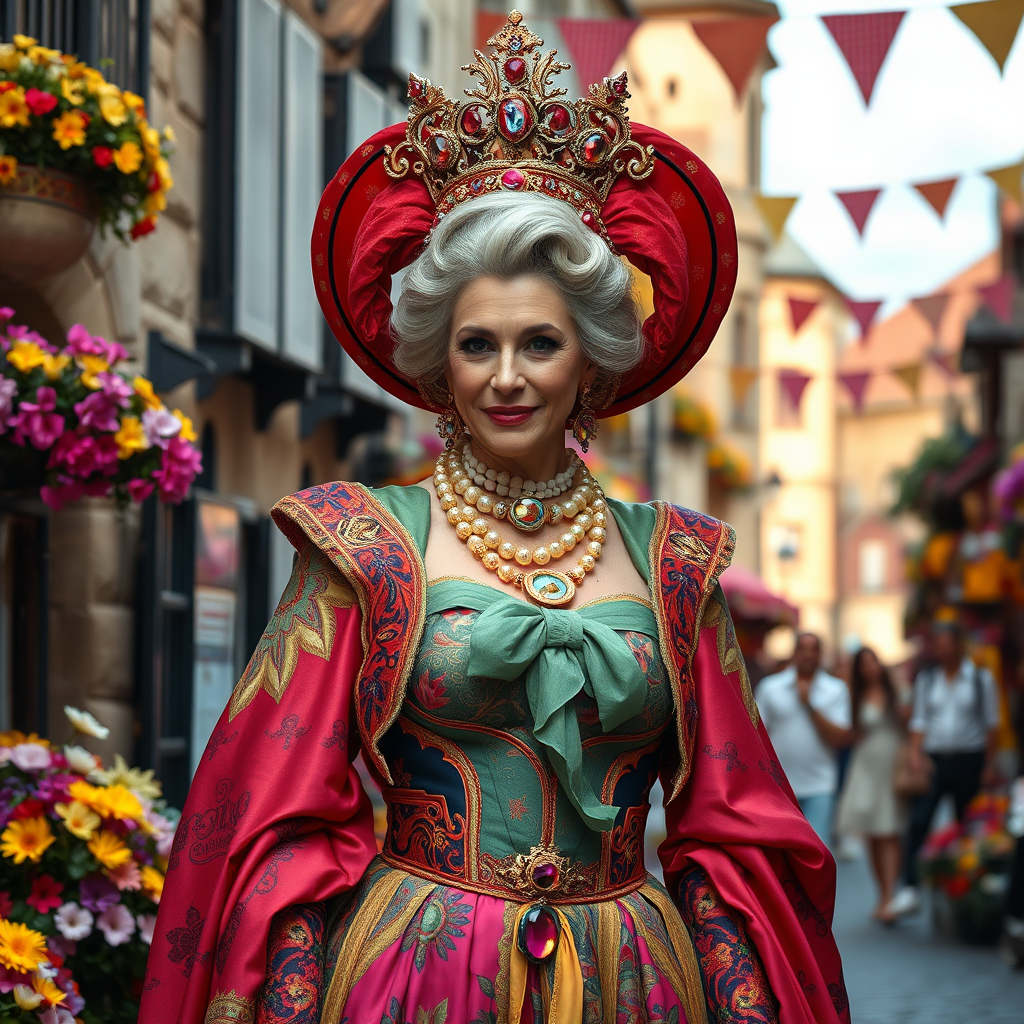 An elegant and commanding queen, dressed in vibrant and avant-garde attire, stands amidst a lively and festive scene. The air is filled with joy as colorful flowers bloom around, and the backdrop of medieval architecture adds a touch of timeless grandeur. The summer street brims with life, capturing the essence of a true masterpiece in this absurdly whimsical and visually stunning environment.