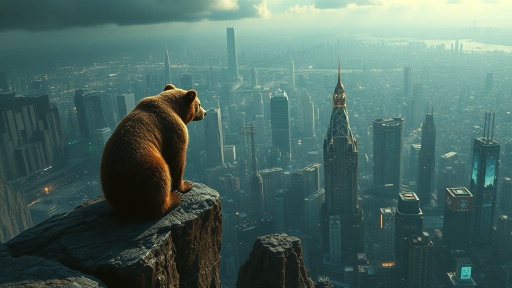 An elegant anthropomorphic bear perched majestically on a cliff, gazing over a sprawling cyberpunk metropolis. The scene is inspired by the art styles of Karol Bak, Alex Horley, Bruce Pennington, and Jon Foster, blending hyperrealism with cinematic allure. The composition is rich with intricate details and crafted on a colossal scale, utilizing advanced techniques like global illumination and the capabilities of Unreal Engine to bring the vision to life. The setting captures the contrast between the natural elegance of the bear and the futuristic complexity of the city below, portrayed with an ar 2:3 aspect ratio for an expansive view.