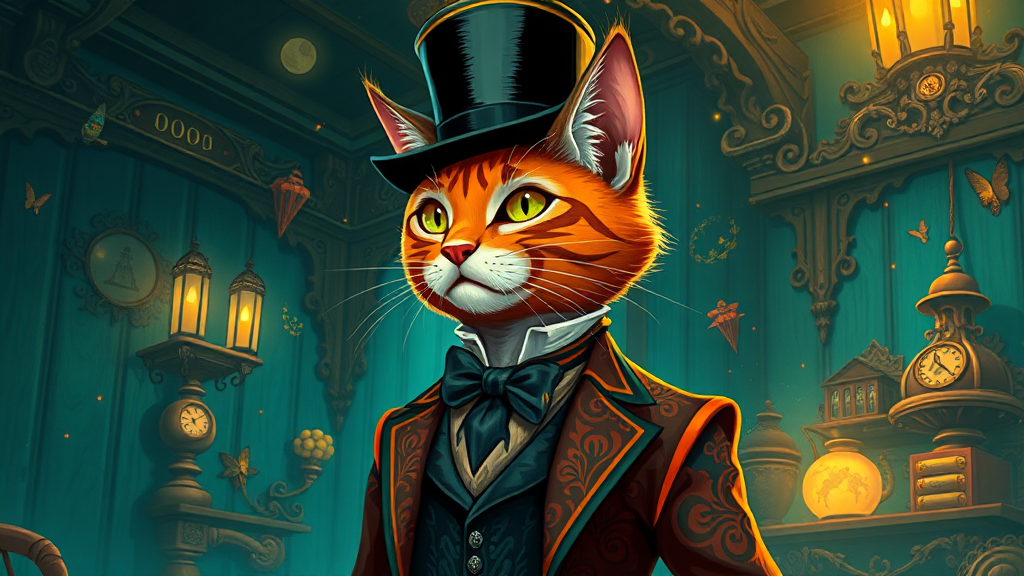 An elegant anthropomorphic cat dressed in a Victorian-style suit, with intricate patterns resembling a tapestry, in a necropunk setting. The color palette is dominated by vibrant cyan and warm orange tones, creating a striking contrast in 2D game art style. The background features ornate wooden elements and whimsical, fantastical objects that blend seamlessly into the scene. The cat's fur is sleek, and it wears a top hat tilted jauntily to the side, giving off fancy vibes. The atmosphere is slightly chaotic yet captivating, with swirling surreal elements in the air as though caught in a gentle breeze, and a mix of ancient artifacts and mystical symbols accentuate the setting.