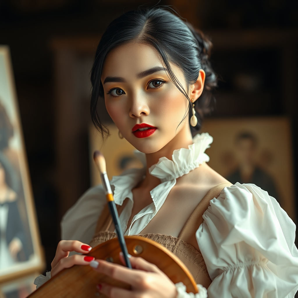 An elegant Asian female dressed as a classic French artist, holding a palette and brush, gazes confidently at the viewer. The scene showcases her in a portrait-style photograph, capturing the intricate details of her skin and features, with a focus on realism and photo-realism. The frame is full-length, presenting her in a chic, sophisticated manner. The image is highly detailed, rendered in 8k resolution with vibrant RAW color art. The lighting is soft and diffused, creating a cinematic atmosphere with a shallow depth of field and sharp focus, bringing hyperrealism to the forefront. Background elements are blurred, emphasizing her presence. The scene is free of distractions, errors, or artifacts, ensuring a clean, pristine composition with perfect anatomy and proportions.