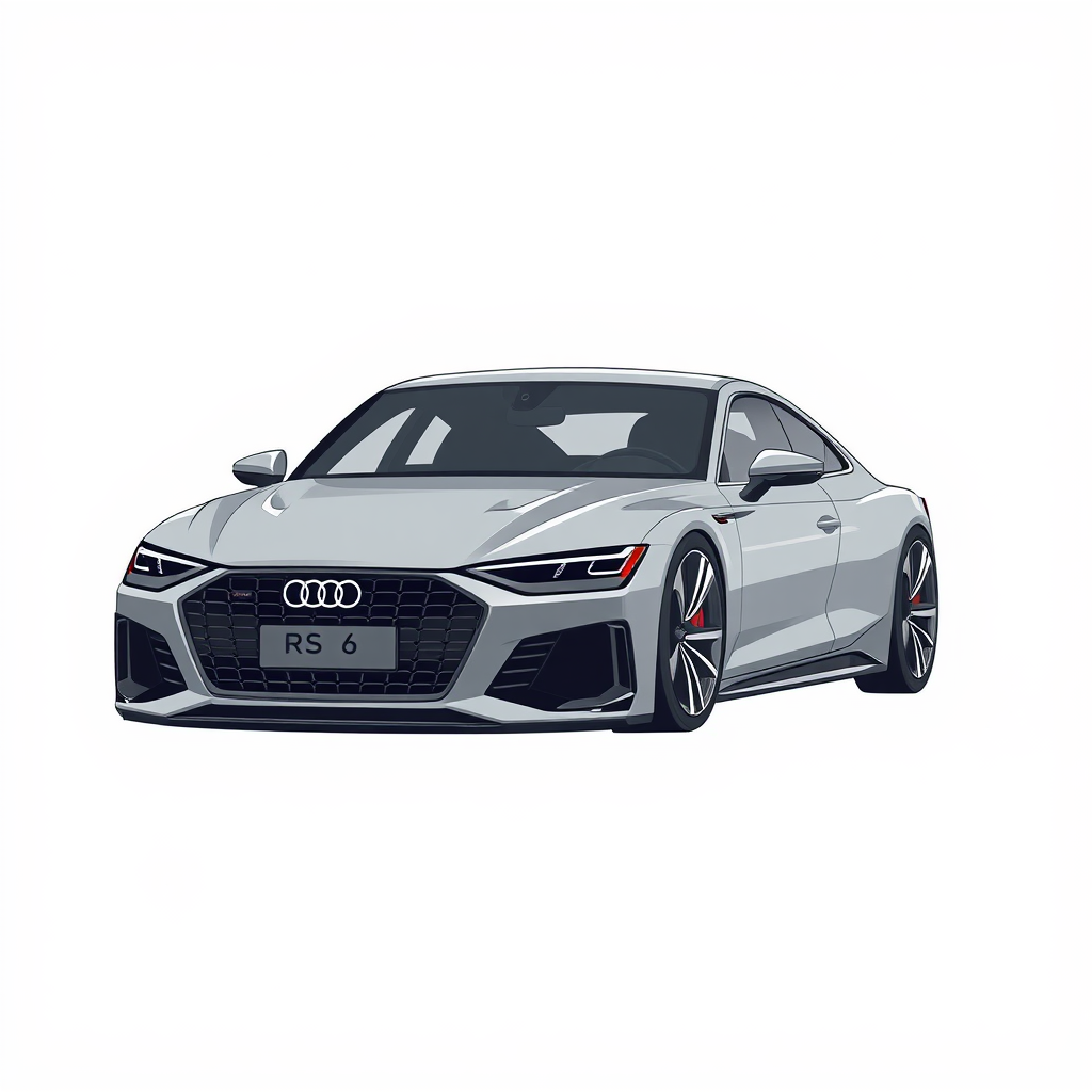 An elegant Audi RS8 concept car depicted in a minimalist illustration style with a white backdrop, blending traditional oil painting techniques and simplistic cartoon forms. The design features larme kei influences with simple line work and a predominantly gray color palette, incorporating subtle pastel accents to convey a dreamy, whimsical aesthetic.
