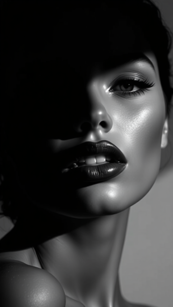 An elegant black and white photograph of an alluring woman's face, with a focus on her captivating lips highlighted by deep shadows, intended for advertising or a fashion magazine cover. The composition is modern and minimalist, featuring high contrast and a sense of mystery. The style is artistic and iconic, exuding simplicity and beauty while remaining stylish and powerful. The image is designed to be striking and captivating, embodying a minimalist yet sophisticated aesthetic with subtle creative touches that enhance its visual impact.