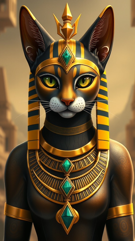 An elegant feline deity adorned in golden jewelry, the Egyptian goddess Bastet embodies grace and protection, her eyes shimmering like precious emeralds, as she watches over the land from her serene temple, a gentle guardian of home and hearth, with a gentle yet fiercely protective nature reminiscent of a majestic lioness safeguarding her pride.