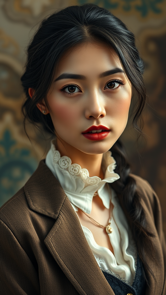 An elegant woman dressed as a French artist, captured in a portrait that exudes realism and depth. Her attire is chic and sophisticated, drawing inspiration from classic painter aesthetics. She looks confidently at the viewer, her expression full of artistic flair. The image boasts detailed and lifelike skin textures, with an 8k resolution that highlights every facet of her presence. Colored in rich, raw hues, the scene is illuminated by soft, diffused lighting that adds a cinematic touch. The setting is sharply focused with a shallow depth of field, creating a hyperrealistic portrayal. Her Asian heritage adds to the unique blend of elements, with the overall composition demonstrating high skill in CGI without falling into common pitfalls of distortion or unrealistic features. The result is a graceful and true-to-life representation that maintains artistic integrity and visual allure.