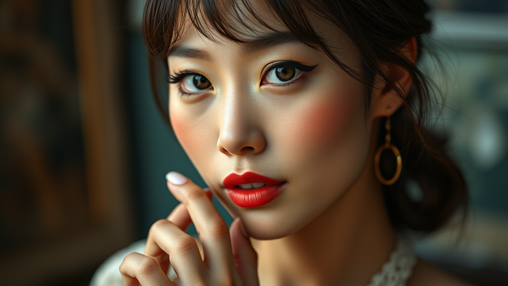 An elegant woman embodying the essence of a French artist, poses for a portrait with a captivating gaze. Her attire exudes sophistication, reminiscent of a painter immersed in creativity. The portrait showcases her with detailed, realistic skin, captured in an 8k, highly detailed frame. The color palette is raw and vibrant, emphasizing her features in hyperrealistic style. Soft, diffused lighting enhances her expressive face, while a shallow depth of field ensures sharp focus on her. The composition is cinematic, highlighting her Asian heritage with a blend of CGI elements to enhance realism. The setting excludes any low-quality artifacts, ensuring a flawless representation with correct anatomy, balanced proportions, and natural limb positioning. Her fingers are elegantly posed, and her proportions are artistically perfect, ensuring no distortions or duplications exist in the image.