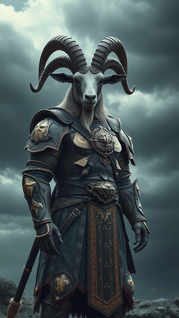 An elite goat warrior clad in sumptuous Viking armor, exuding an aura of haunting magnificence with intricate details, every inch of the attire showcasing hypermaximalist and ornate craftsmanship. The figure stands with an ominous presence, akin to a mythical guardian from a lost age, its eyes filled with an ancient wisdom and fierce determination. The armor glistens with the luxury of forgotten empires, each embellishment telling stories of past conquests. A cinematic tableau akin to the styles of James Jean, Brian Froud, and Ross Tran, where the scene unfolds like a grand matte painting, blending fantasy with a touch of the ethereal under a sky roiling with stormy anticipation, evoking both wonder and unease in a mesmerizing CGSociety masterpiece.