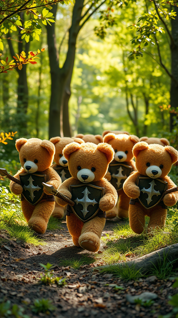 An elite squadron of plush teddy bears, exuding a sense of whimsical strength, embarks on a playful adventure through a vibrant, enchanted forest, their plush fur glistening under the dappled sunlight as they march in unison, each bear holding tiny handcrafted shields and swords; the scene is filled with a sense of charming determination and soft-hearted bravery.
