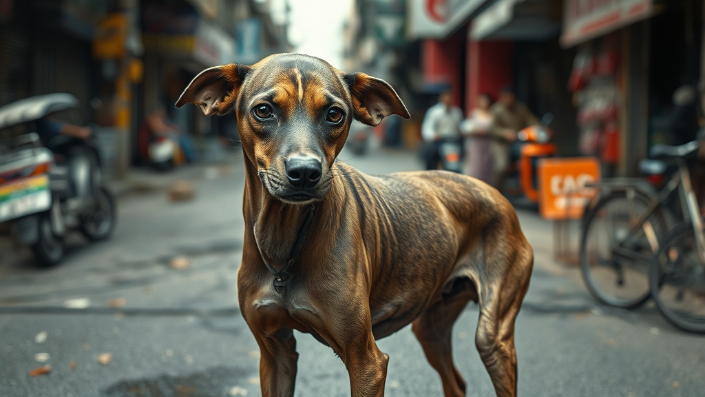 An emaciated and forlorn dog, its coat matted and filthy, stands on a bustling and grimy street in Bangkok. Its eyes, filled with melancholy and longing, meet the camera's gaze unwaveringly. The soft, diffused light casts gentle shadows on its skeletal form. Captured on Agfa Vista 200, the scene reveals the vivid textures of urban decay in high definition — every detail of the street and the dog’s fragile figure brought to life. The aspect ratio is an expansive 16:16, enveloping the desolate scene in a profound stillness that enhances the emotional impact of the solitary creature amidst the busy backdrop.