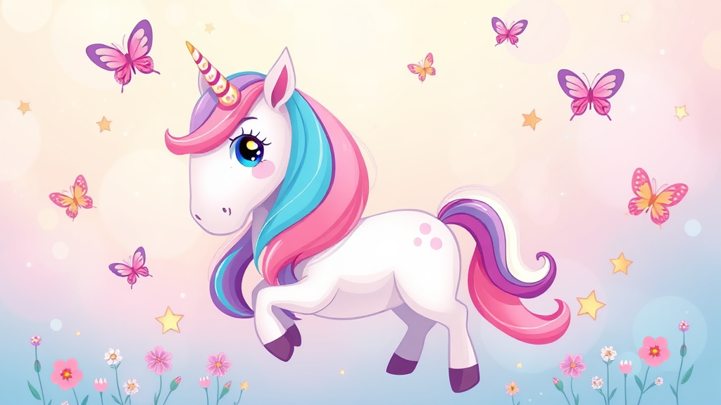 An enchanting and vibrant illustration depicting a whimsical unicorn, adorned with a prismatic mane and tail, set against a dreamy pastel backdrop. The unicorn's sparkling eyes and playful pose exude charm and innocence, reminiscent of a charming clip art style. The scene is filled with delightful details—fluttering butterflies, twinkling stars, and delicate flowers—creating a lovely and cute composition. This artwork is perfect for an ArtStation gallery, capturing the magic and allure of a mythical world with a touch of joyful fantasy.