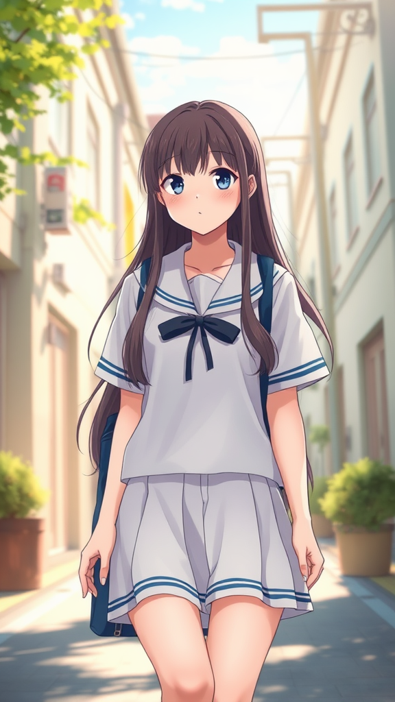 An enchanting anime girl strolling down a sunlit street in a pristine school uniform, crafted with breathtaking smooth anime CG artistry. She embodies the essence of a cute and beautiful high school girl, her features brought to life in a realistic 3D anime style. This visual captures the allure of a young anime girl, akin to a striking key visual from a beloved visual novel, meticulously painted in an anime artist studio. The scene exudes realism, depicting her as a true-to-life schoolgirl with an exceptional anime artstyle, blending the charm of anime with lifelike detail.