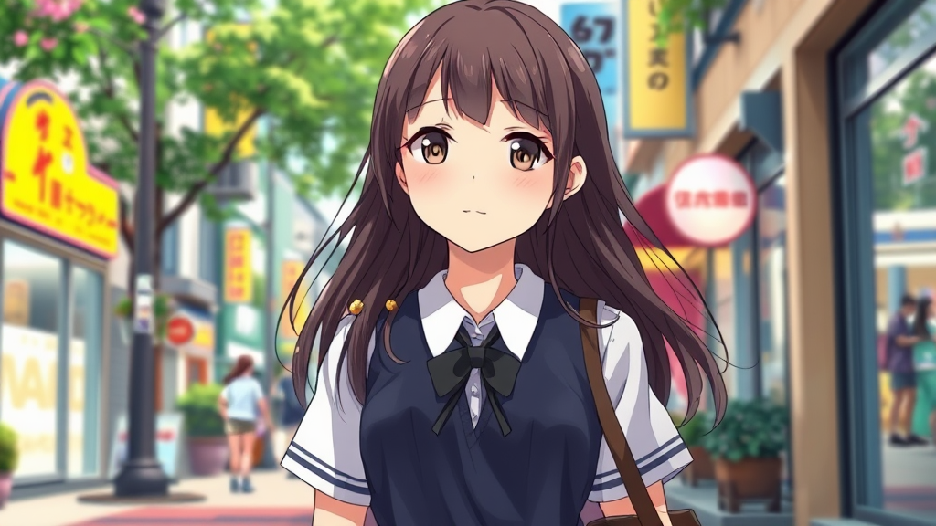 An enchanting anime girl strolls down a vibrant street, her school uniform perfectly complementing her youthful charm. The scene unfolds with smooth, high-quality anime CG art, capturing her in a realistic 3D anime style that brings her features to life. Portrayed with the elegance of a visual novel key visual, she exudes the innocent allure of a cute high school girl. Her striking yet realistic depiction is crafted as if painted in an anime artist's studio, where each detail emphasizes her youthful beauty and the serene atmosphere of her surroundings.