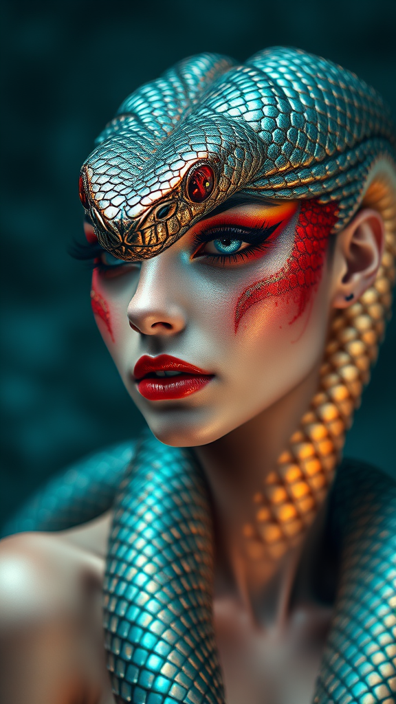 An enchanting anthropomorphic female snake adorned with exquisite red, blue, and gold makeup, shimmering against a dark teal and white backdrop. Her scales reflect the aurorapunk aesthetic, capturing a mesmerizing blend of realism and artistic flair. The portrait showcases detailed textures and lifelike features, creating an immersive, enchanting visual experience. The vivid colors and stylized elements enhance the mystical atmosphere, drawing viewers into a surreal world where beauty and wonder intertwine.