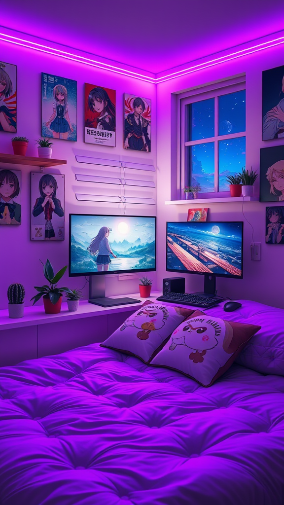 An enchanting bedroom where anime posters adorn the walls, illuminated by a soft glow of purple LED lights casting gentle shadows around the room. Small potted plants and adorable cacti are carefully placed on shelves and the window sill, adding a touch of fresh greenery. A sleek gaming setup, complete with a high-resolution monitor displaying a vibrant anime scene, echoes the room's otaku essence. The plush bedspread is adorned with cute character-themed pillows, enhancing the cozy, aesthetic vibe. The night sky peeks through the window, adding a tranquil background to this charming visual novel-like setting.