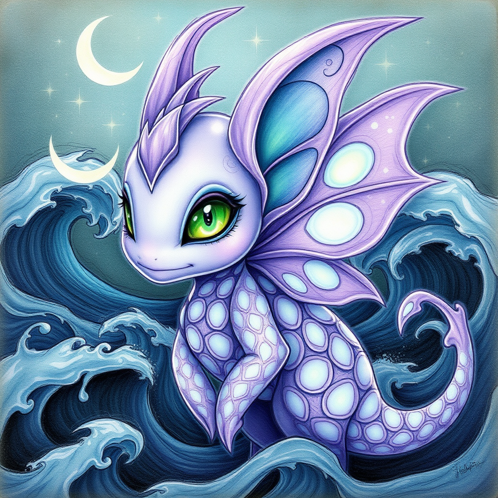 An enchanting fae with emerald eyes and shimmering lavender scales adorned with moon-shaped patterns, set against a mystic background of swirling waves. Created in the style of Darwyn Cooke's illustrations, this captivating creature embodies whimsy and magic. Exquisite sketch drawing illustration at 800x800 resolution, capturing the creature's mystical aura with subtle creative touches, like delicate stardust trails weaving through the air.