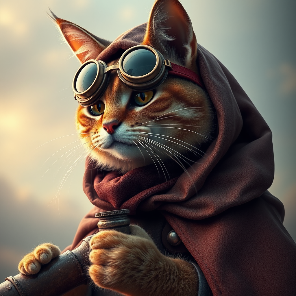 An enchanting hyperrealistic image of a whimsical cat adorned in a Victorian-era cloak and vintage aviator goggles, gripping an antique telescope, gazing intently towards the horizon, infused with steampunk elements, reminiscent of John Wilhelm's style, with a touch of bunnycore charm and ratcore edginess, delivering a harmonious blend of realism and stylized character depth.