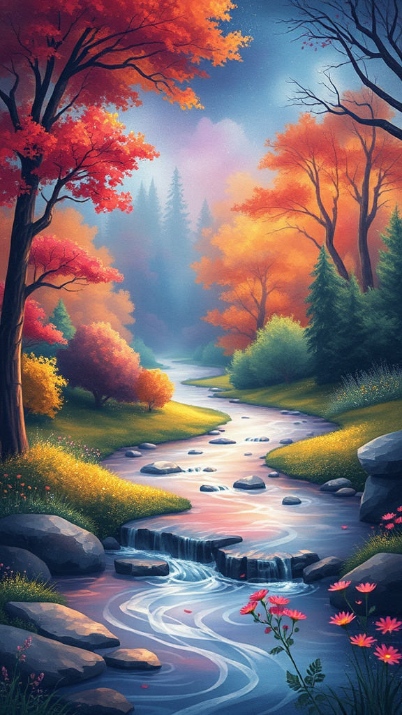 An enchanting illustration, a serene landscape exuding tranquility and calmness with a vibrant, wooded background in a symphony of colors, featuring a gently flowing river in the foreground, all rendered in a whimsical, fairy tale style.